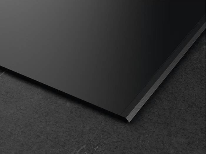 i Характер огранки фаски на внешней стороне варочной панели. Металлические рамки предотвращают забивание монтажных швов крошками и пылью.