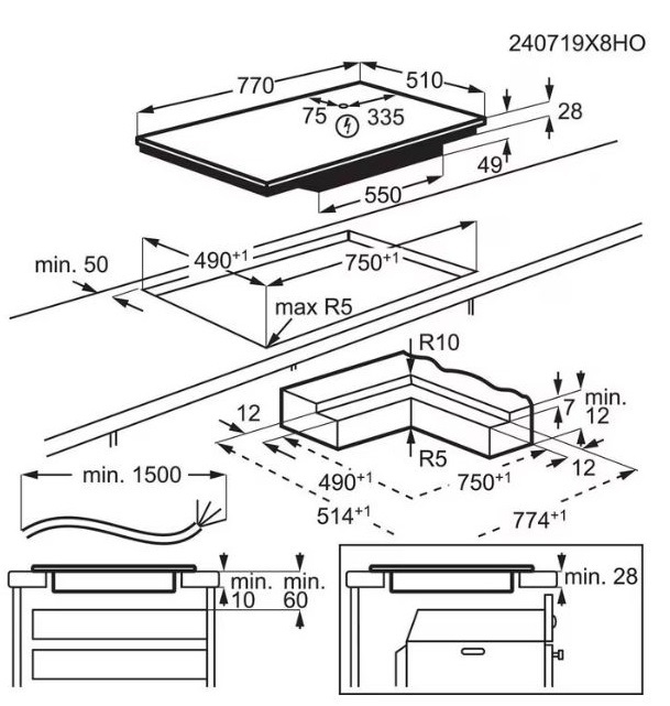 i Характер огранки фаски на внешней стороне варочной панели. Металлические рамки предотвращают забивание монтажных швов крошками и пылью.