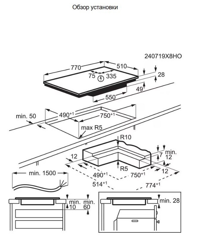 i Характер огранки фаски на внешней стороне варочной панели. Металлические рамки предотвращают забивание монтажных швов крошками и пылью.