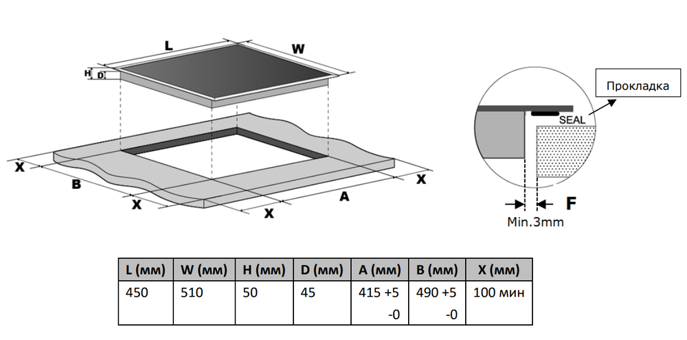 i Характер огранки фаски на внешней стороне варочной панели. Металлические рамки предотвращают забивание монтажных швов крошками и пылью.