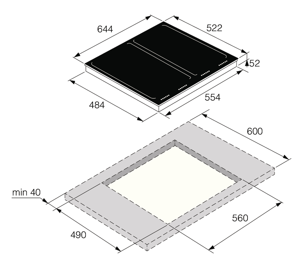i Характер огранки фаски на внешней стороне варочной панели. Металлические рамки предотвращают забивание монтажных швов крошками и пылью.