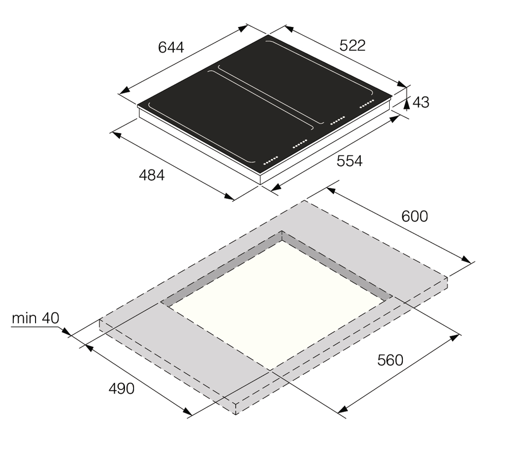 i Характер огранки фаски на внешней стороне варочной панели. Металлические рамки предотвращают забивание монтажных швов крошками и пылью.