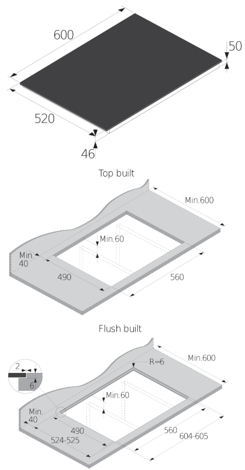 i Характер огранки фаски на внешней стороне варочной панели. Металлические рамки предотвращают забивание монтажных швов крошками и пылью.