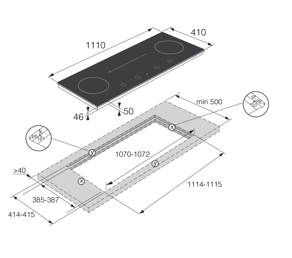 i Характер огранки фаски на внешней стороне варочной панели. Металлические рамки предотвращают забивание монтажных швов крошками и пылью.