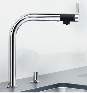 i Встроенная в кран насадка на длинном гибком шланге с металлической оплеткой. Насадки с кнопкой могут переключать обычный излив воды на душ.