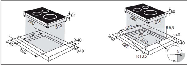 i Характер огранки фаски на внешней стороне варочной панели. Металлические рамки предотвращают забивание монтажных швов крошками и пылью.