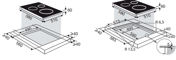 i Характер огранки фаски на внешней стороне варочной панели. Металлические рамки предотвращают забивание монтажных швов крошками и пылью.