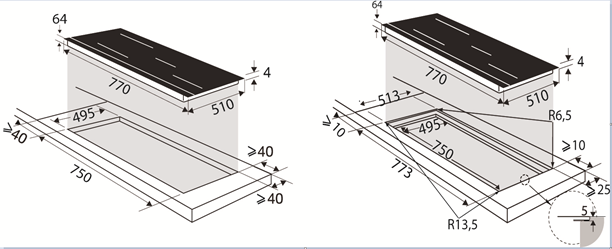 i Характер огранки фаски на внешней стороне варочной панели. Металлические рамки предотвращают забивание монтажных швов крошками и пылью.