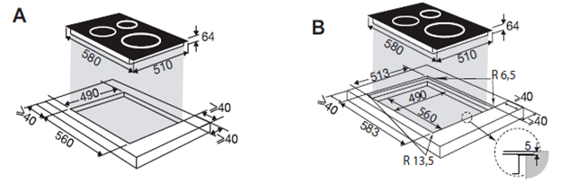 i Характер огранки фаски на внешней стороне варочной панели. Металлические рамки предотвращают забивание монтажных швов крошками и пылью.