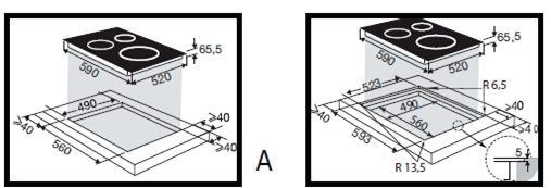 i Характер огранки фаски на внешней стороне варочной панели. Металлические рамки предотвращают забивание монтажных швов крошками и пылью.