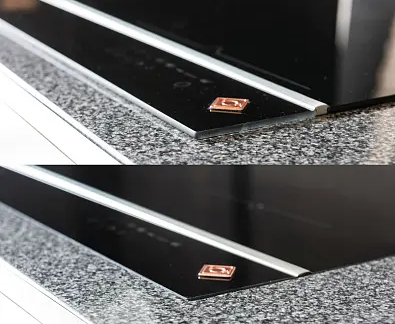 i Характер огранки фаски на внешней стороне варочной панели. Металлические рамки предотвращают забивание монтажных швов крошками и пылью.