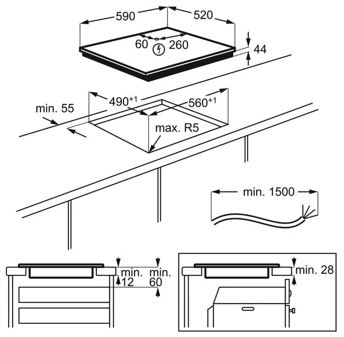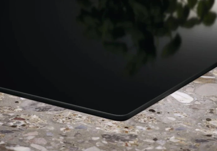 i Характер огранки фаски на внешней стороне варочной панели. Металлические рамки предотвращают забивание монтажных швов крошками и пылью.