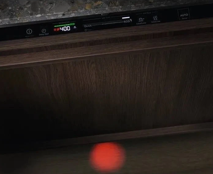 i Индикация окончания программного цикла для тихих моделей. Пока посудомойка работает, цветной индикатор проецируется на полу возле дверцы.
