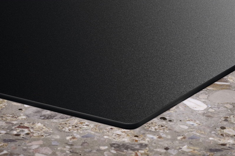 i Характер огранки фаски на внешней стороне варочной панели. Металлические рамки предотвращают забивание монтажных швов крошками и пылью.