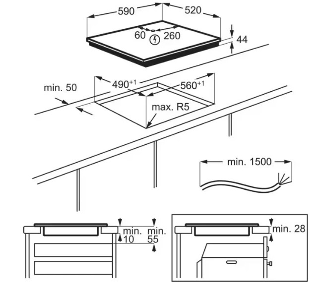 i Характер огранки фаски на внешней стороне варочной панели. Металлические рамки предотвращают забивание монтажных швов крошками и пылью.