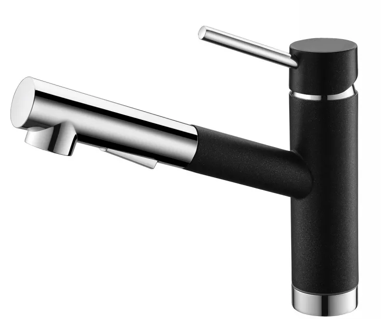 i Встроенная в кран насадка на длинном гибком шланге с металлической оплеткой. Насадки с кнопкой могут переключать обычный излив воды на душ.