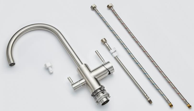 i Встроенная в кран насадка на длинном гибком шланге с металлической оплеткой. Насадки с кнопкой могут переключать обычный излив воды на душ.