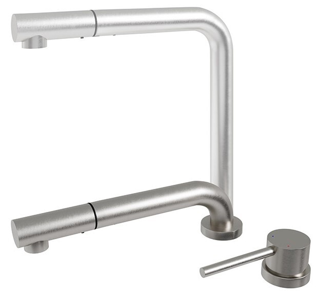i Встроенная в кран насадка на длинном гибком шланге с металлической оплеткой. Насадки с кнопкой могут переключать обычный излив воды на душ.