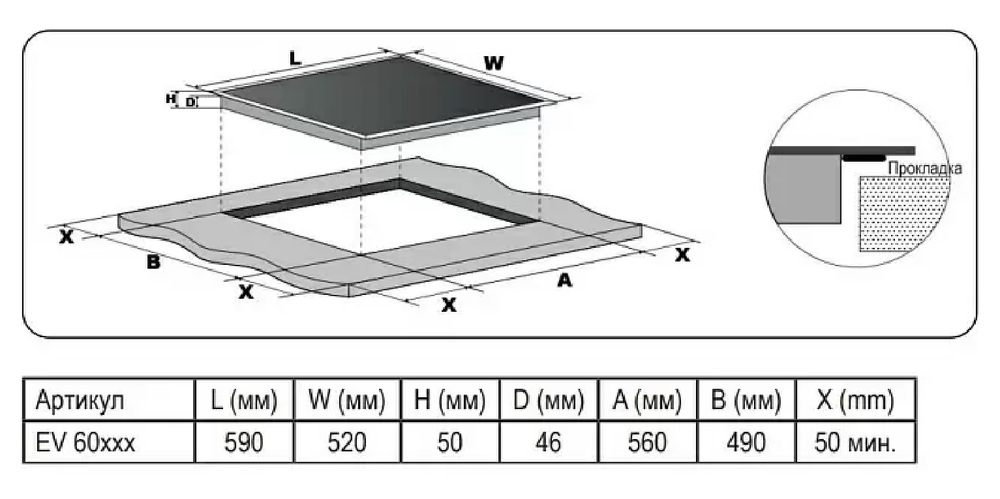 i Характер огранки фаски на внешней стороне варочной панели. Металлические рамки предотвращают забивание монтажных швов крошками и пылью.