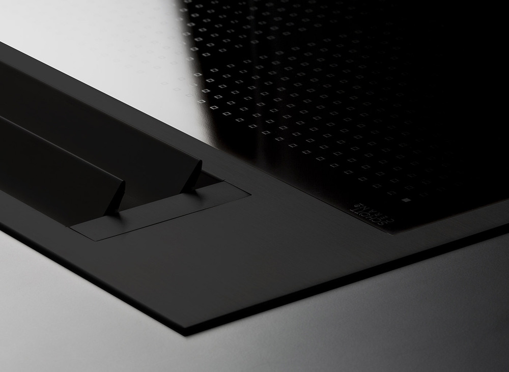 i Характер огранки фаски на внешней стороне варочной панели. Металлические рамки предотвращают забивание монтажных швов крошками и пылью.