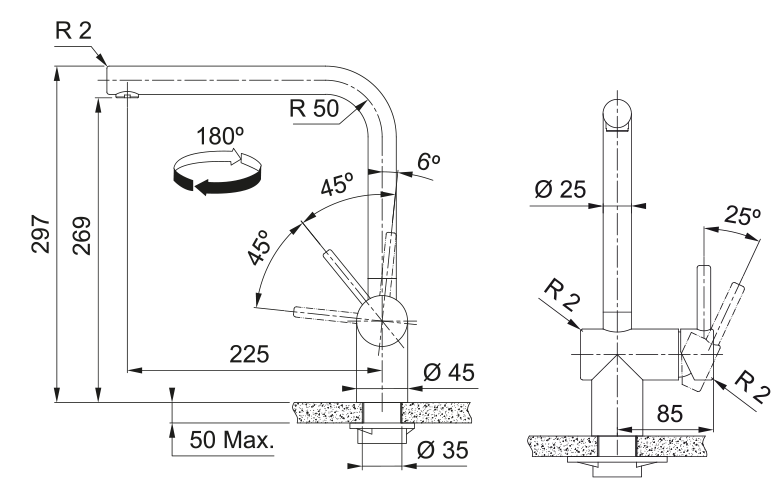 i Встроенная в кран насадка на длинном гибком шланге с металлической оплеткой. Насадки с кнопкой могут переключать обычный излив воды на душ.