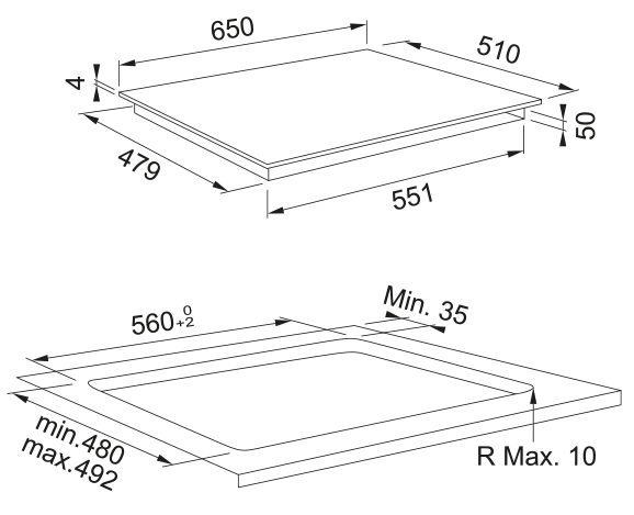 i Характер огранки фаски на внешней стороне варочной панели. Металлические рамки предотвращают забивание монтажных швов крошками и пылью.