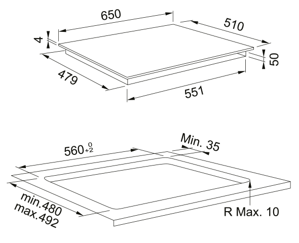i Характер огранки фаски на внешней стороне варочной панели. Металлические рамки предотвращают забивание монтажных швов крошками и пылью.