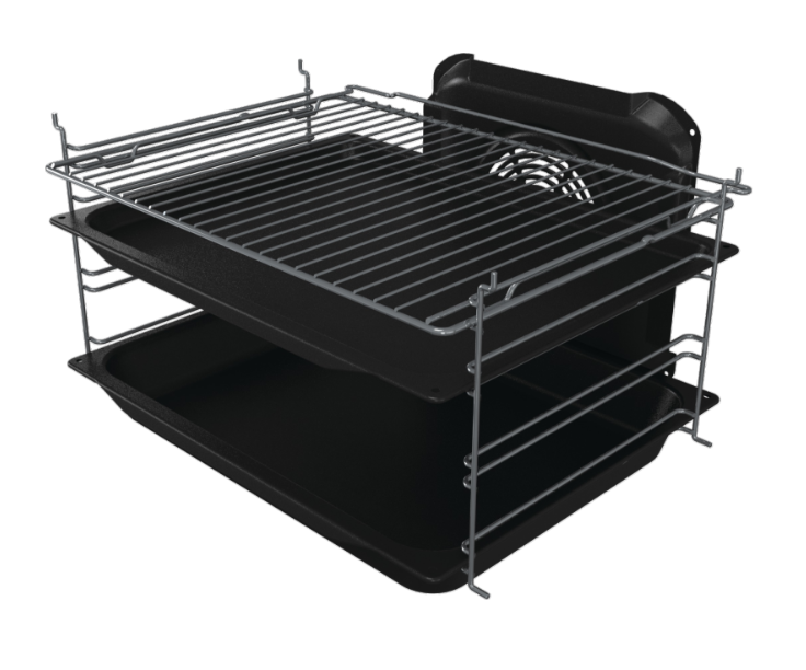 i Выдвижные металлические полозья, которые легко выезжают за пределы камеры духовки вместе с противнем, не давая ему упасть.
