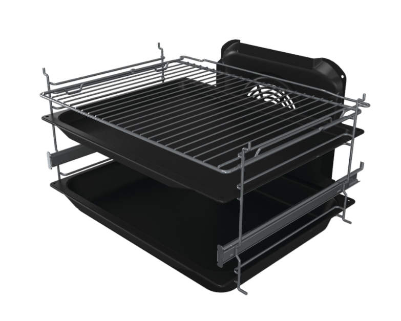 i Выдвижные металлические полозья, которые легко выезжают за пределы камеры духовки вместе с противнем, не давая ему упасть.