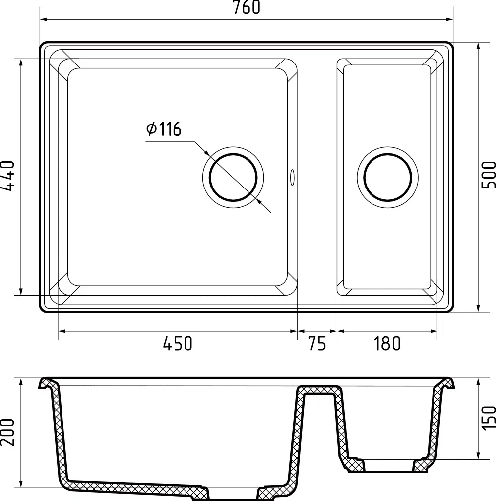 i Расстояние от дна до верхней кромки чаши мойки. Оптимальная глубина — 15-18 см. Чем глубже мойка, тем меньше брызг попадет наружу.