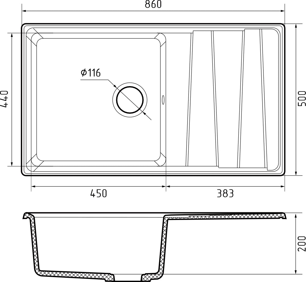 i Расстояние от дна до верхней кромки чаши мойки. Оптимальная глубина — 15-18 см. Чем глубже мойка, тем меньше брызг попадет наружу.