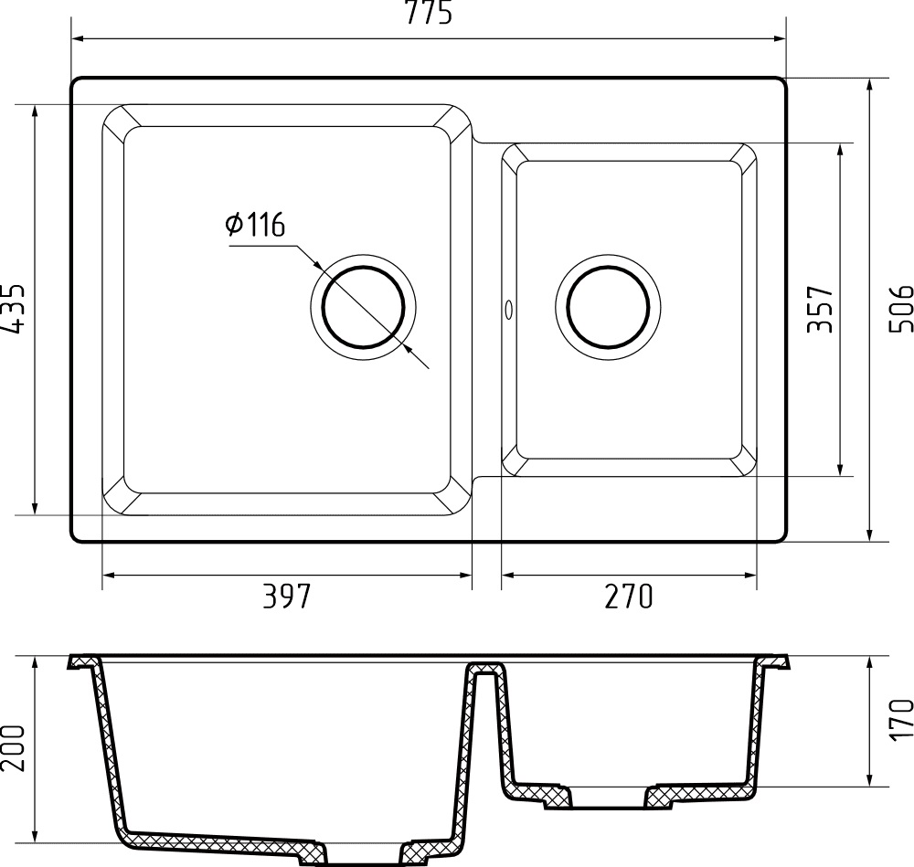 i Расстояние от дна до верхней кромки чаши мойки. Оптимальная глубина — 15-18 см. Чем глубже мойка, тем меньше брызг попадет наружу.