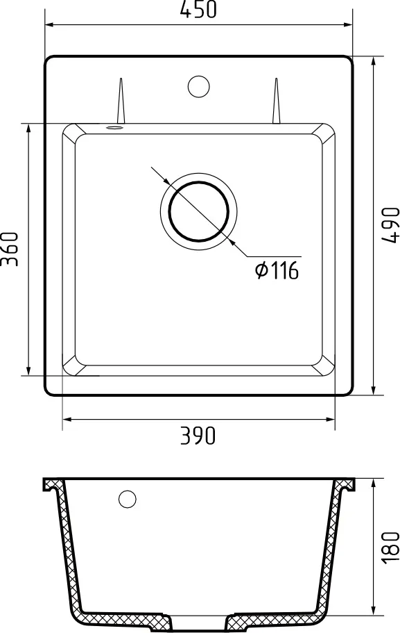 i Расстояние от дна до верхней кромки чаши мойки. Оптимальная глубина — 15-18 см. Чем глубже мойка, тем меньше брызг попадет наружу.