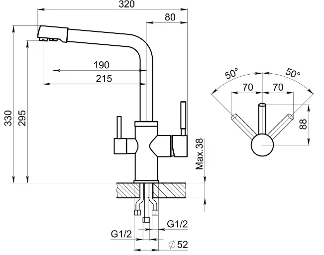 i Встроенная в кран насадка на длинном гибком шланге с металлической оплеткой. Насадки с кнопкой могут переключать обычный излив воды на душ.