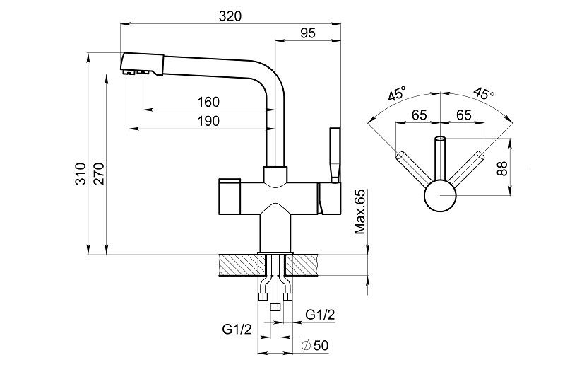 i Встроенная в кран насадка на длинном гибком шланге с металлической оплеткой. Насадки с кнопкой могут переключать обычный излив воды на душ.