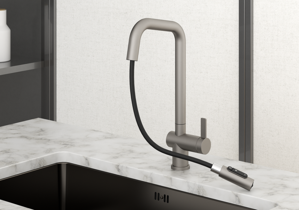i Встроенная в кран насадка на длинном гибком шланге с металлической оплеткой. Насадки с кнопкой могут переключать обычный излив воды на душ.
