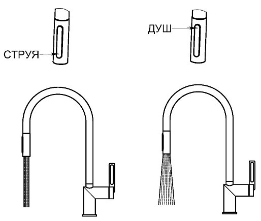 i Встроенная в кран насадка на длинном гибком шланге с металлической оплеткой. Насадки с кнопкой могут переключать обычный излив воды на душ.