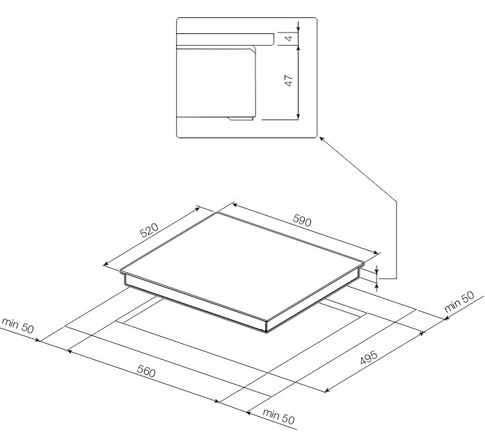 i Характер огранки фаски на внешней стороне варочной панели. Металлические рамки предотвращают забивание монтажных швов крошками и пылью.