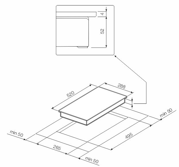 i Характер огранки фаски на внешней стороне варочной панели. Металлические рамки предотвращают забивание монтажных швов крошками и пылью.