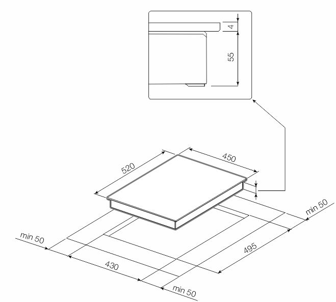 i Характер огранки фаски на внешней стороне варочной панели. Металлические рамки предотвращают забивание монтажных швов крошками и пылью.