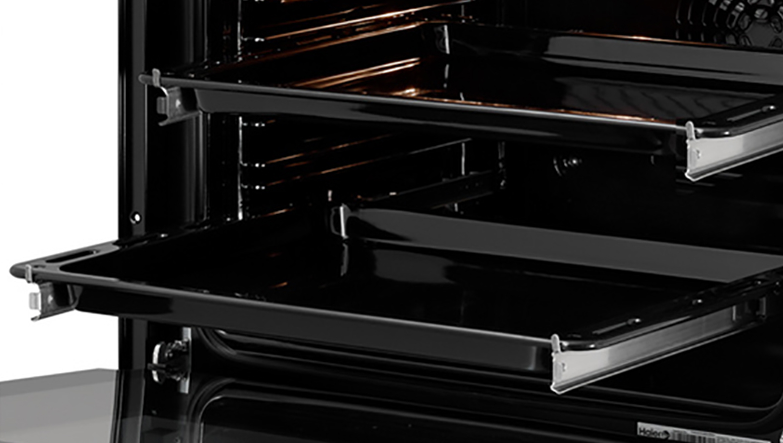 i Выдвижные металлические полозья, которые легко выезжают за пределы камеры духовки вместе с противнем, не давая ему упасть.