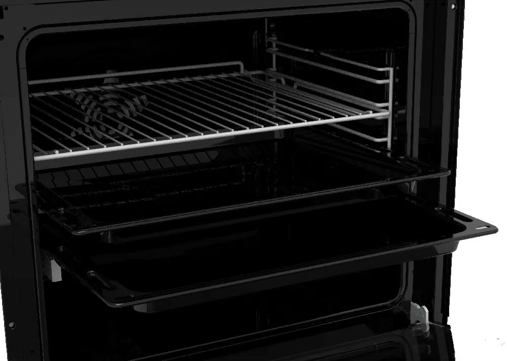 i Выдвижные металлические полозья, которые легко выезжают за пределы камеры духовки вместе с противнем, не давая ему упасть.