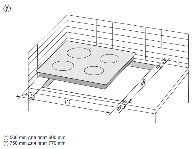 i Характер огранки фаски на внешней стороне варочной панели. Металлические рамки предотвращают забивание монтажных швов крошками и пылью.