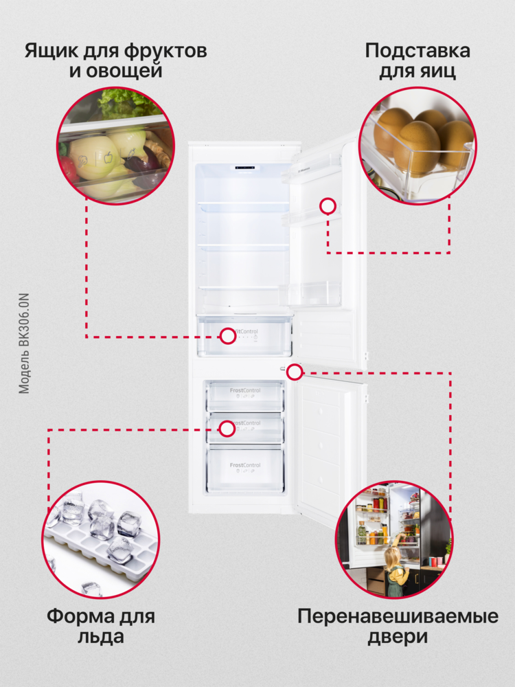 i Морозильная камера может быть расположена сверху, снизу от основной камеры, Side-by-Side. Также она может отсутствовать вовсе.