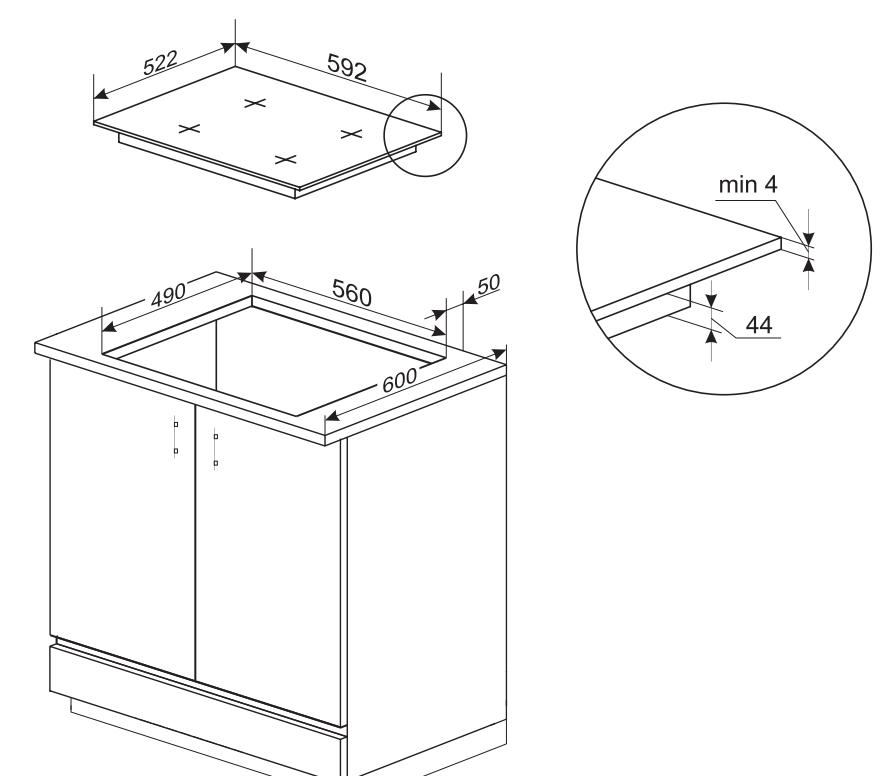 i Характер огранки фаски на внешней стороне варочной панели. Металлические рамки предотвращают забивание монтажных швов крошками и пылью.