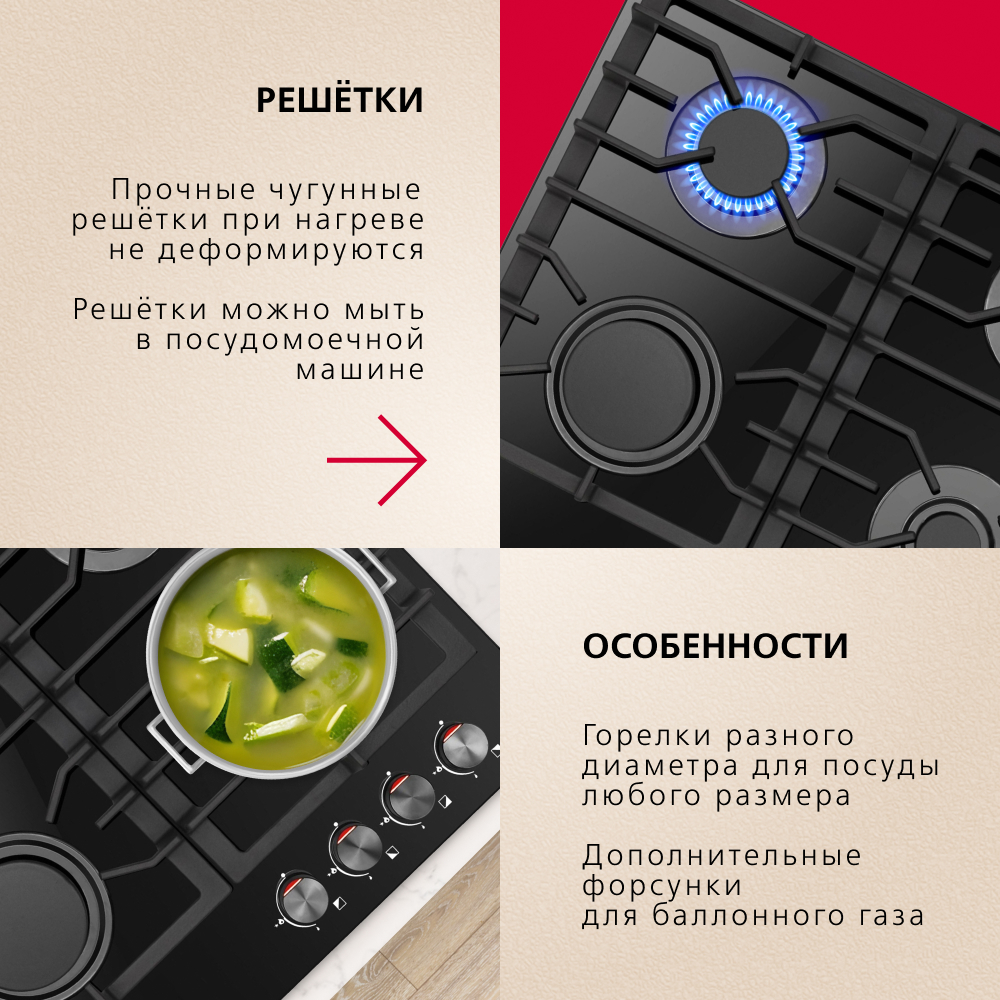 i Приборы могут имеют разное количество газовых, электрических и индукционных конфорок. Выбирайте оптимальный вариант для комфортной готовки.