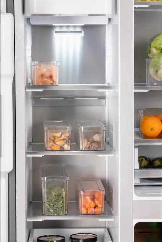 i В зоне свежести температура держится на уровне 0°С, так продукты дольше остаются свежими. Подходит для свежего мяса, рыбы, фруктов, овощей.