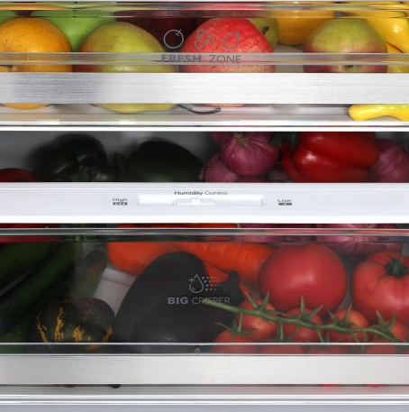 i В зоне свежести температура держится на уровне 0°С, так продукты дольше остаются свежими. Подходит для свежего мяса, рыбы, фруктов, овощей.
