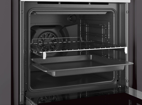 i Выдвижные металлические полозья, которые легко выезжают за пределы камеры духовки вместе с противнем, не давая ему упасть.