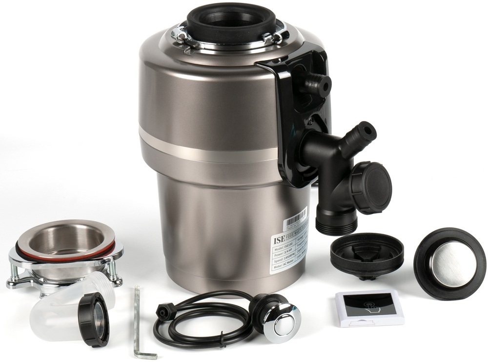 Измельчитель пищевых отходов со встроенным блоком пневмопуска, встраиваемая кнопка пневмовыключателя, пульт дистанционного управления, батарейка CR2032, заглушка-толкатель, фланец установки на мойку в сборе, брызгозаградительное кольцо, выпускное колено с отводом для посудомоечной машины, кабель 1 м с вилкой, инструкция. |